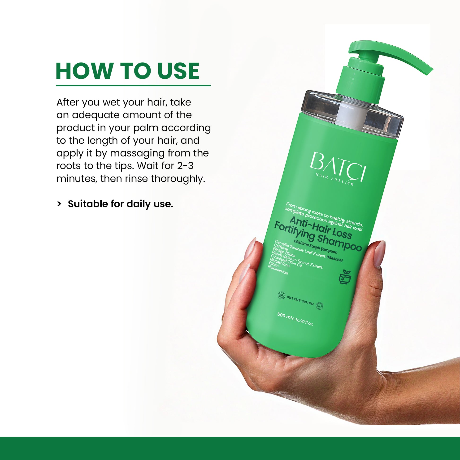 El champú anticaída BATCI es eficaz contra la caída del cabello y está dermatológicamente formulado. Fortalece las raíces capilares y le da un aspecto más abundante, saludable y brillante. Con el uso regular, reduce significativamente la caída del cabello, aporta volumen y te ayuda a lograr una apariencia segura. ¡Consigue un cabello fuerte y vibrante con el champú BATCI!